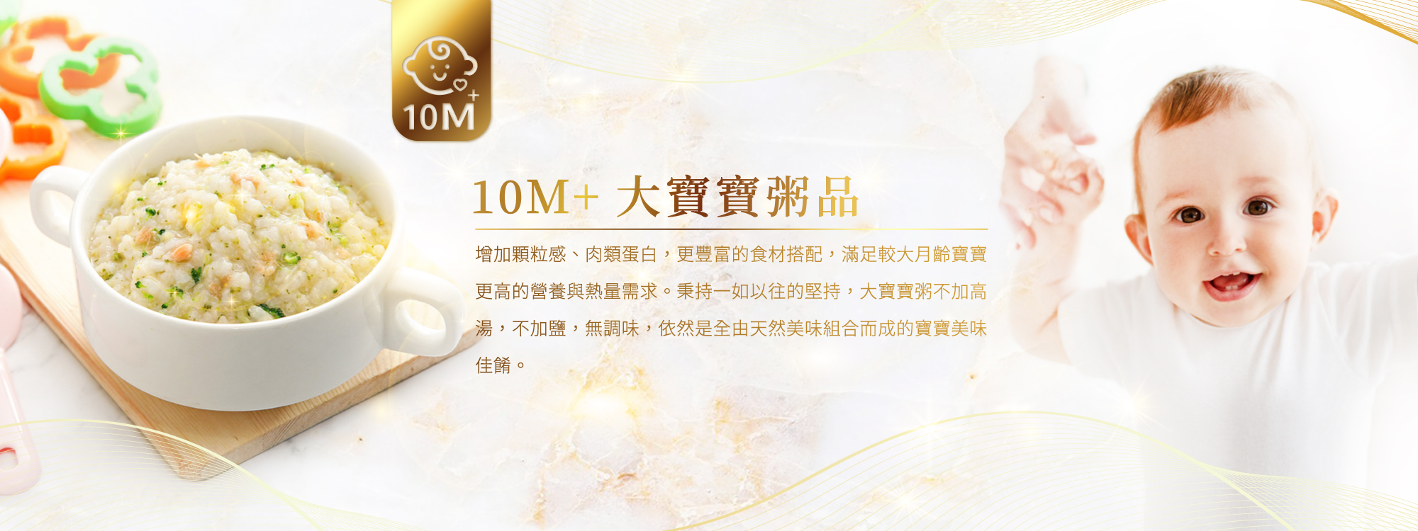 比小寶寶粥增加50%顆粒感,肉類蛋白更大幅增加100%,為的是給較大年齡寶寶滿足更高的營養與熱量需求,與所有寶寶粥系列相同的是,10M+大寶寶粥不加高湯,不加鹽,無調味,依然是全由天然美味組合而成的寶寶美味佳餚。